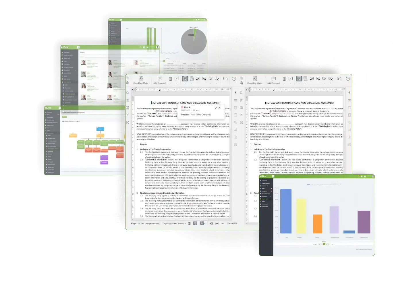 Elevate your document management with elDoc’s powerful text editing tools. Whether you’re drafting comprehensive reports, crafting detailed memos, or developing intricate documents, elDoc delivers a rich text editing environment that mirrors the functionality of top word processing software like Microsoft Word. Our platform enables effortless creation and editing, with a user-friendly interface designed for efficiency and precision. Collaborate seamlessly with team members in real-time, ensuring smooth communication and instant updates on your documents.