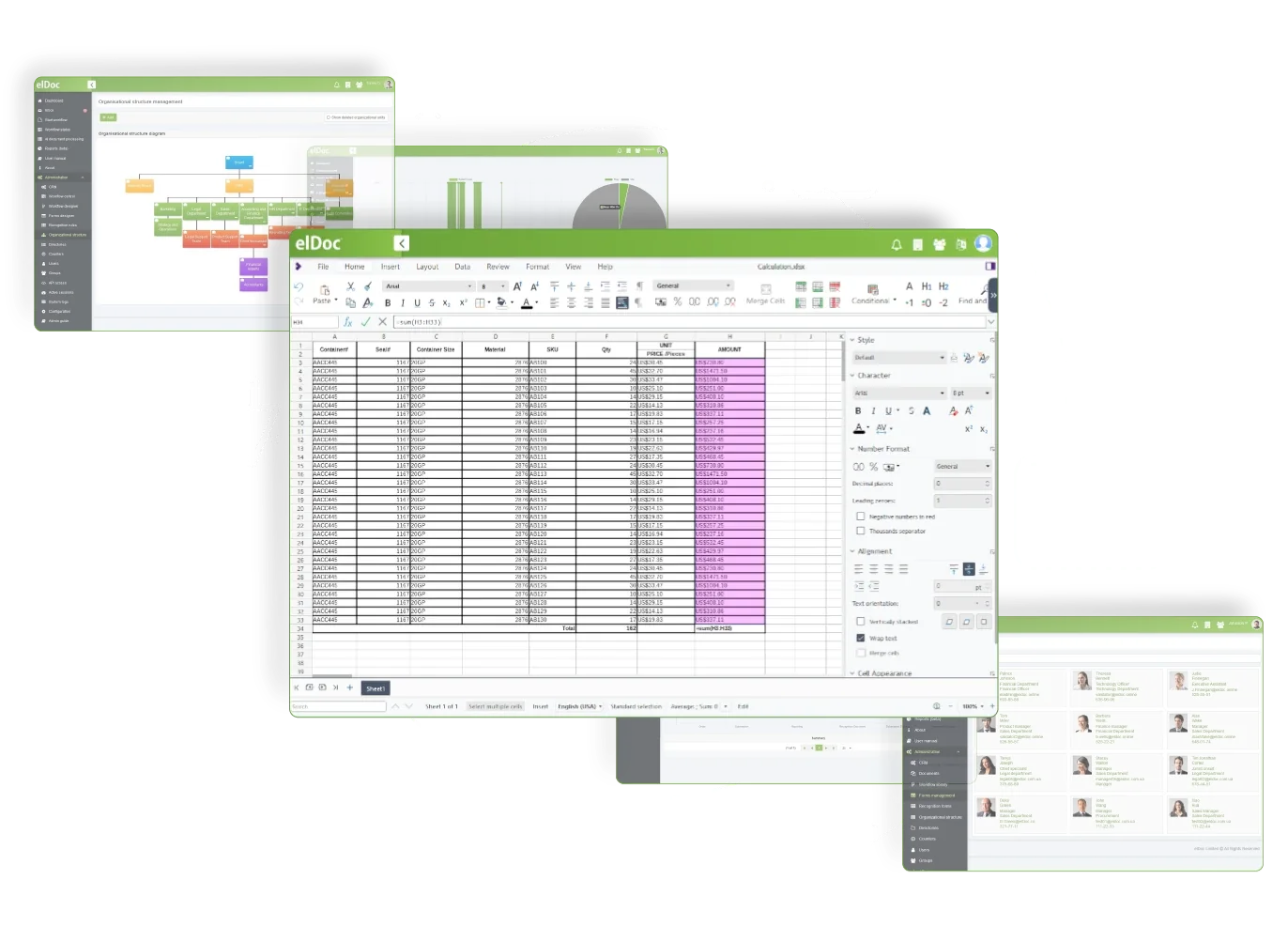 Take control of your data with elDoc’s advanced spreadsheet editor, crafted to deliver the same powerful capabilities you’re accustomed to. Seamlessly manage extensive datasets, perform complex calculations, and analyze information within a single platform. elDoc’s editor supports intricate formulas, chart creation for effective data visualization, and efficient data manipulation, enabling you to organize, sort, and filter information effortlessly. Enjoy robust functionality and a user-friendly interface designed to enhance your data management and analysis—all without needing additional software.